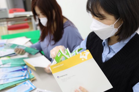 마스크 발송 준비를 하고 있는 한국백혈병어린이재단 직원